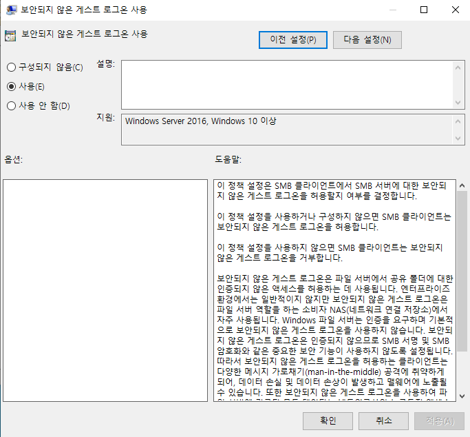 위의 그림에서 "보안되지 않은 게스트 로그온 사용"을 클릭합니다.