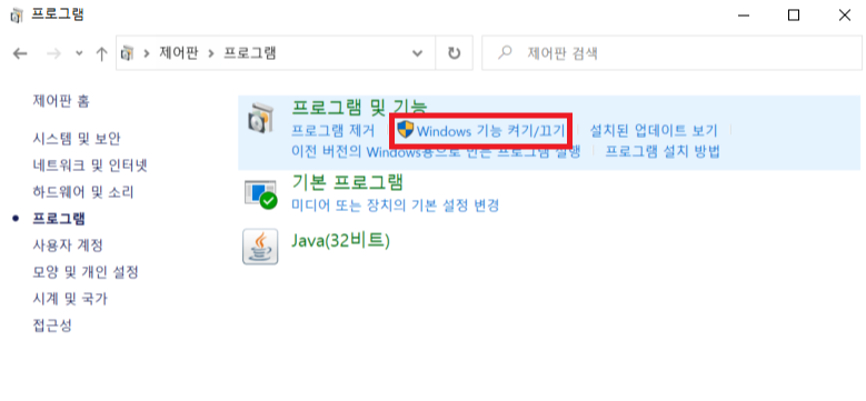 "Windows 기능 켜기/끄기"를 클릭합니다.