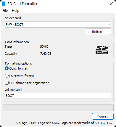 라즈베리파이나 리눅스 시스템, 임베디드 시스템에서 사용하는 SD 카드는 아래와 같은 특별한 포맷 프로그램을 사용해서 전체 용량을 복구하고, 윈도우에서 제대로 사용할 수 있다. 이때 사용하는 프로그램이 SD Memory Card Formatter가 유명하다.