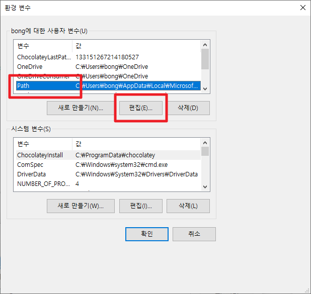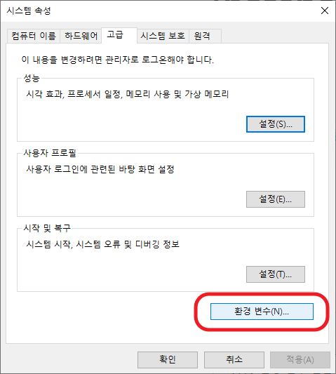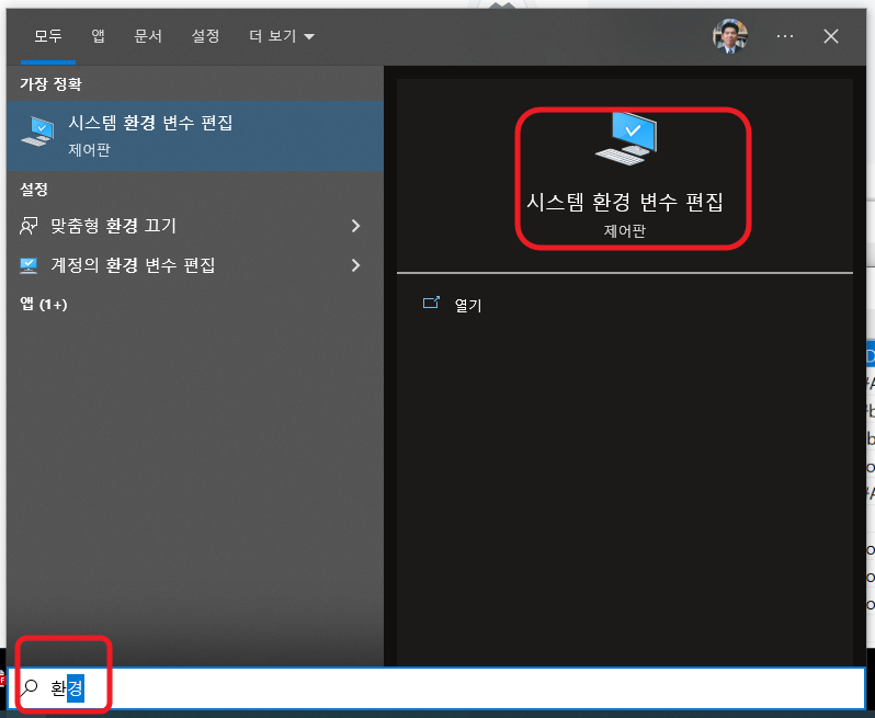 윈도 아래 검색창에 환경 검색해 시스템 환경 변수 앱을 실행한다.