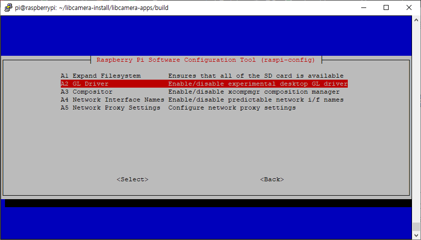 3. $sudo raspi-config 라즈베리파이 설정 화면으로 들어가서 "Advanced Options"로 이동하여 "Glamor" 그래픽 가속을 활성화한다. 아래 이미지를 참고한다.
