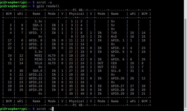 기본 목표가 활성 창의 스크린샷만 캡처하는 것이라면 터미널 명령 "scrot-u"를 사용하십시오. $gpio readall 명령을 수행한 후 $scrot -u 명령을 실행한 스크린 캡처 화면입니다.