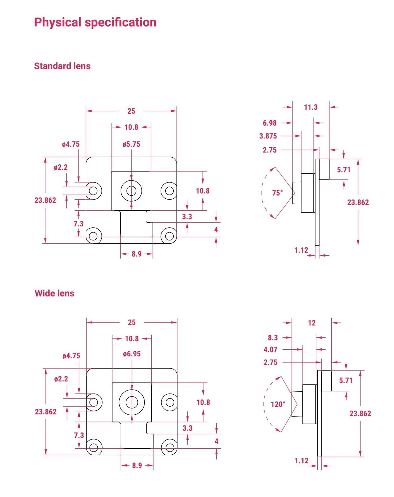 PCB 사이즈와 설치 구멍은 카메라 모듈2와 동일합니다. Z 치수는 다릅니다. 개선된 광학 기능으로 인해 카메라 모듈 3은 카메라 모듈 2보다 몇 밀리미터 더 높습니다.