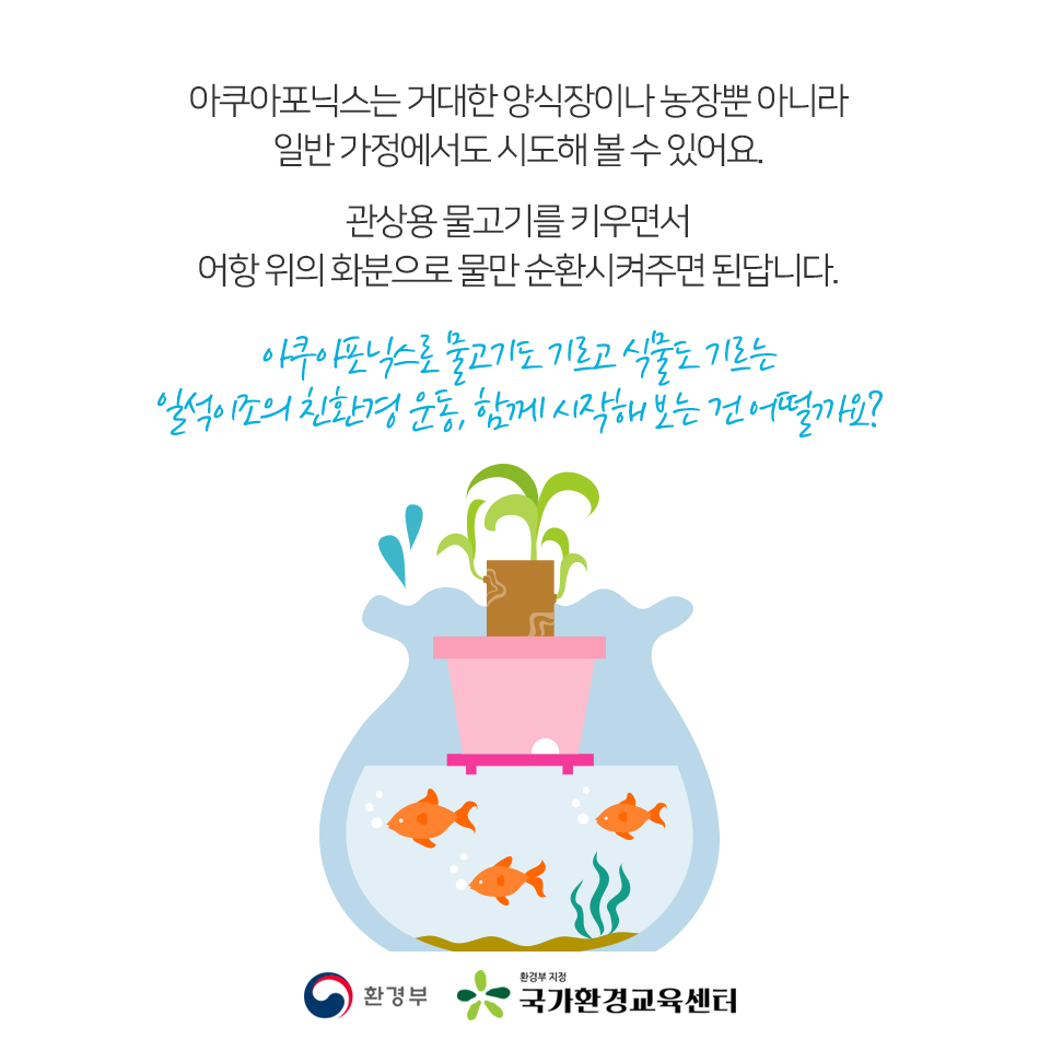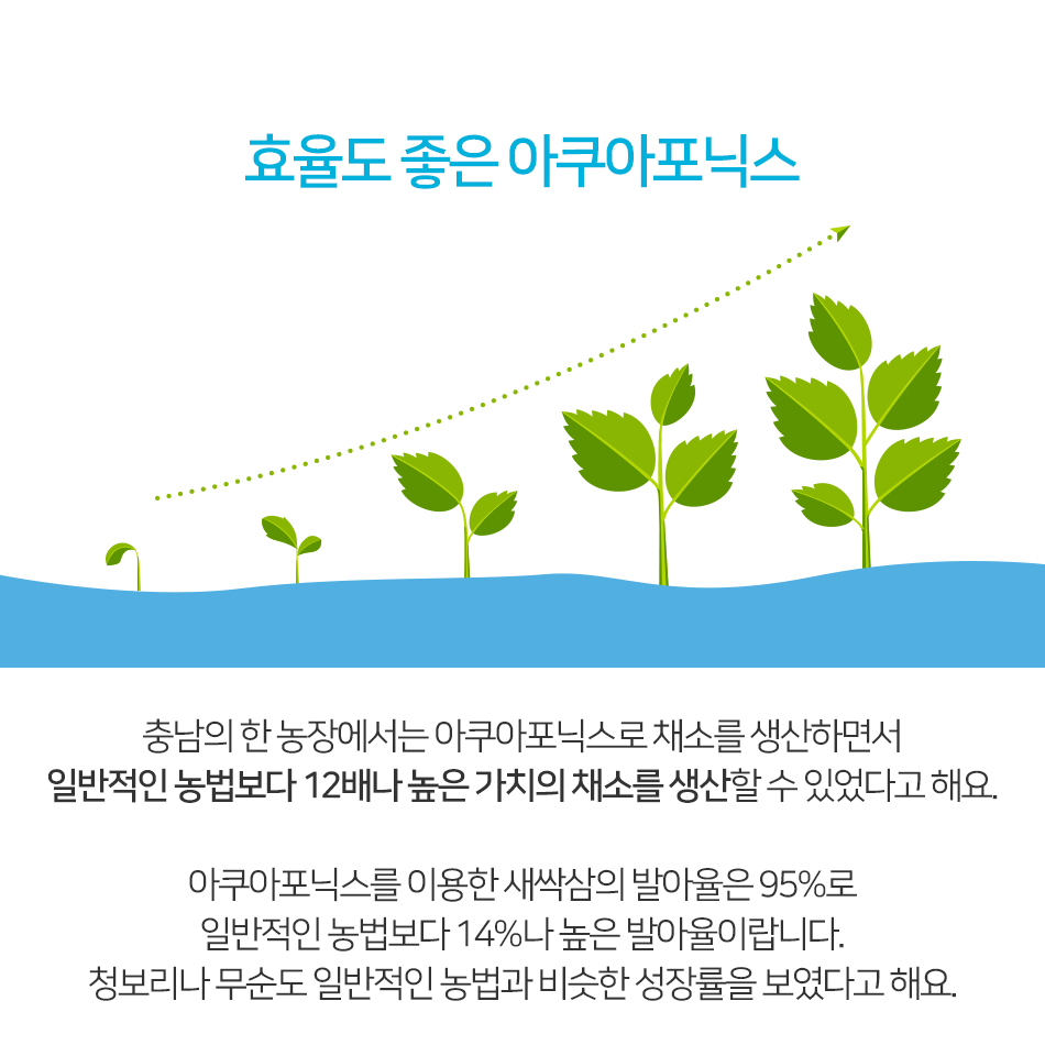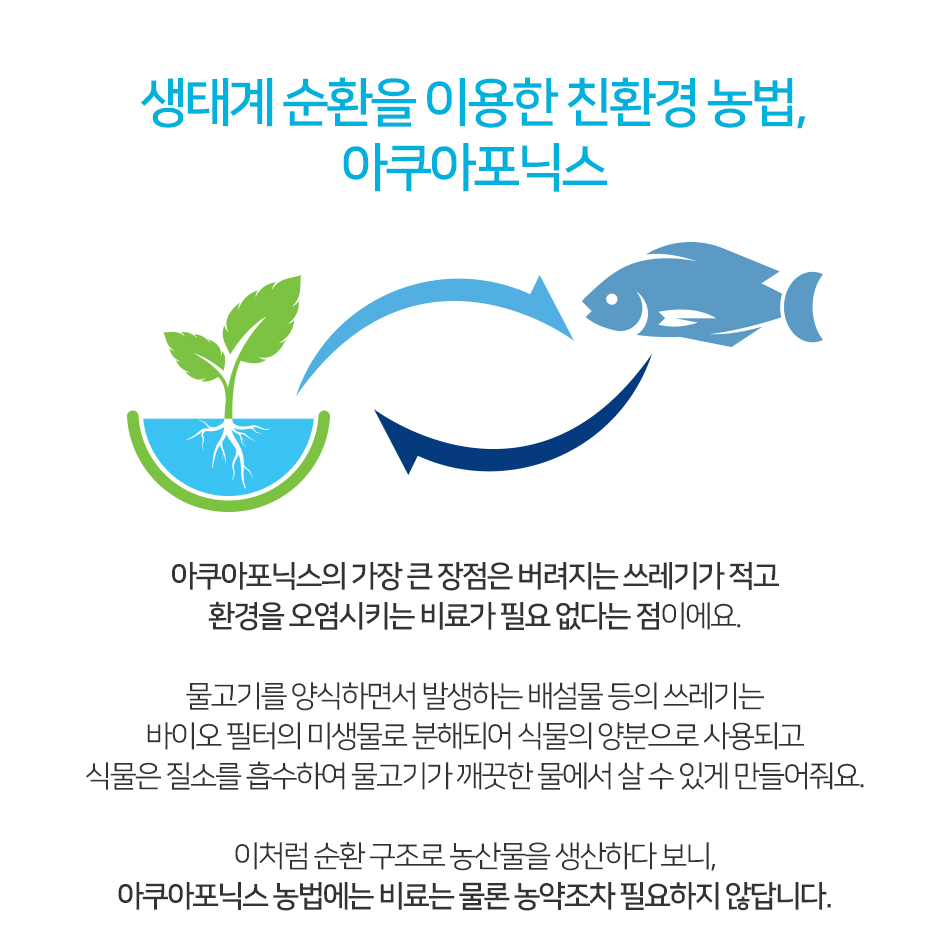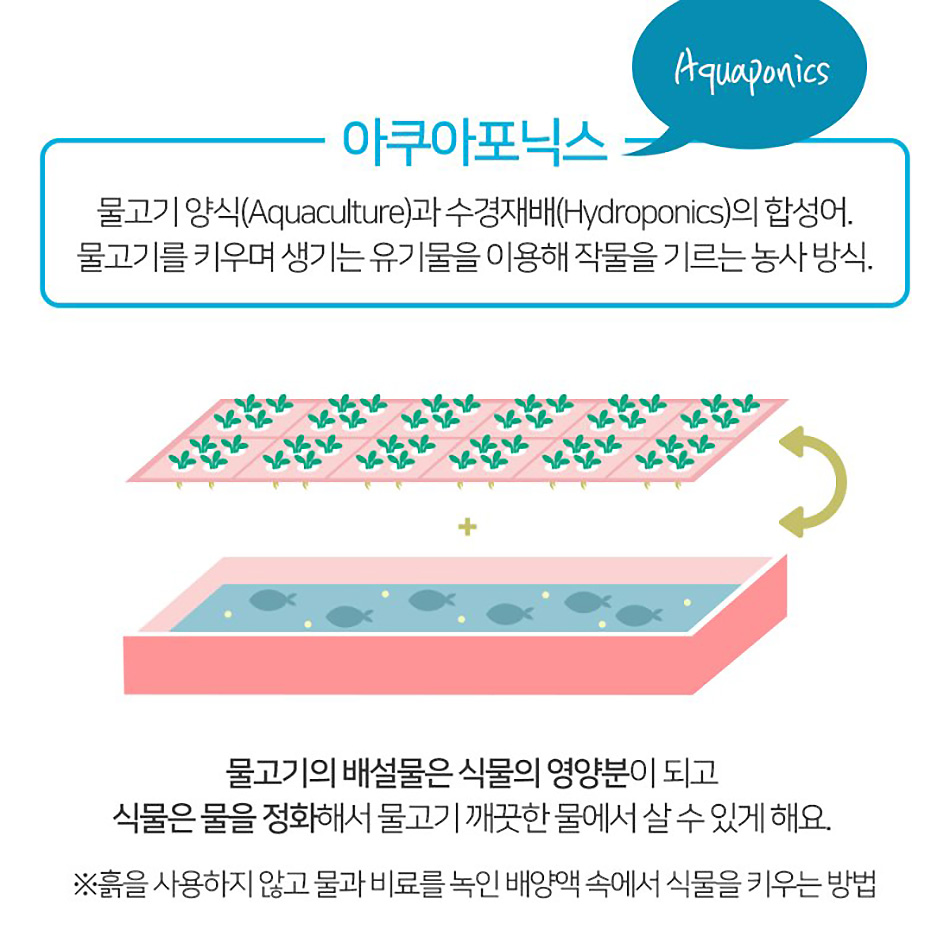 ‘아쿠아포닉스(Aquaponics)’는 ‘물고기 양식(Aquaculture)’과 ‘수경 재배(Hydroponics)’를 결합한 합성어로 물고기를 키우면서 동시에 식물을 재배하는 친환경 농법을 말한다. 식물의 영양분은 물고기의 배설물에서 공급받고, 식물이 정화시킨 깨끗한 물은 다시 물고기에게 공급하는 대표적인 친환경 농법 중 하나로 꼽힌다.