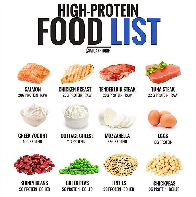 • 껍질 없는 닭가슴살 • 살코기 쇠고기(안심, 등심, 동그란 눈 포함) • 탈지 또는 저지방 우유 • 탈지 또는 저지방 요구르트(& 그리스 요구르트) • 무지방 또는 저지방 치즈 • 계란 • 기름기 없는 돼지고기(안심 • 콩 • 두부 • 유청