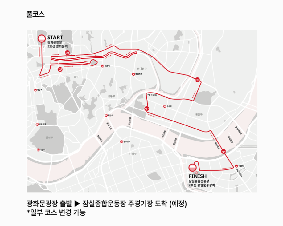 ○ 코스(예정): 광화문광장∼잠실종합운동장<10km 코스는 올림픽공원∼잠실종합운동장>