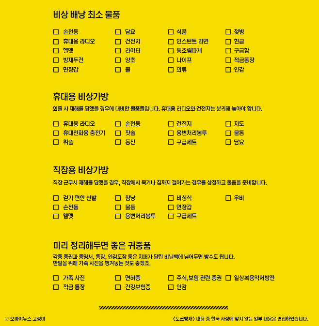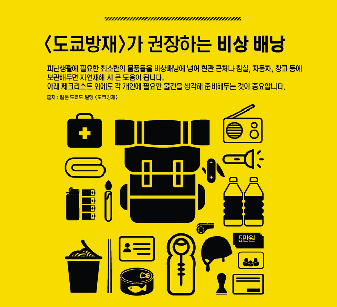 도쿄 지역 특성과 도시 구조, 도민의 라이프스타일 등을 고려하여 재해에 대한 사전 준비와 재해 발생시의 대처법 등, 지금 바로 활용 가능하며 무슨일이 있을 때에도 도움이 되는 정보를 알기 쉽게 정리한 완전 도쿄 사양 방재 굿즈입니다.