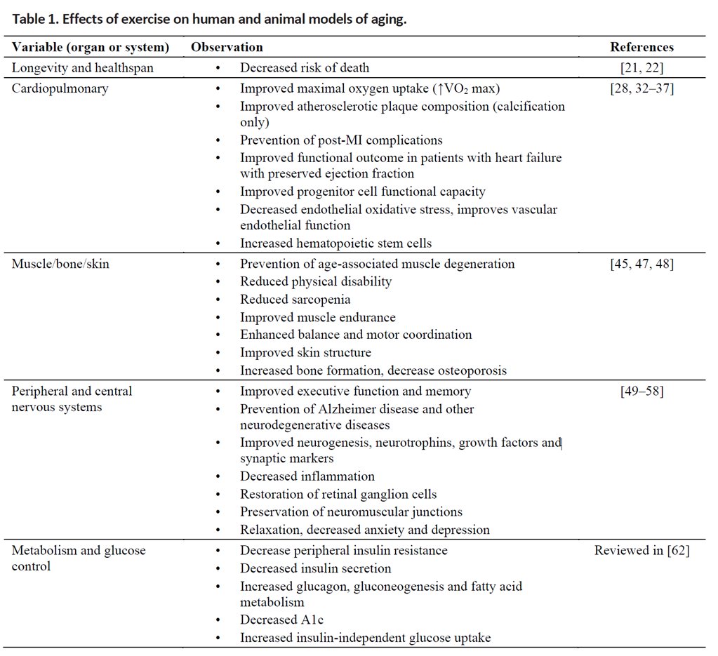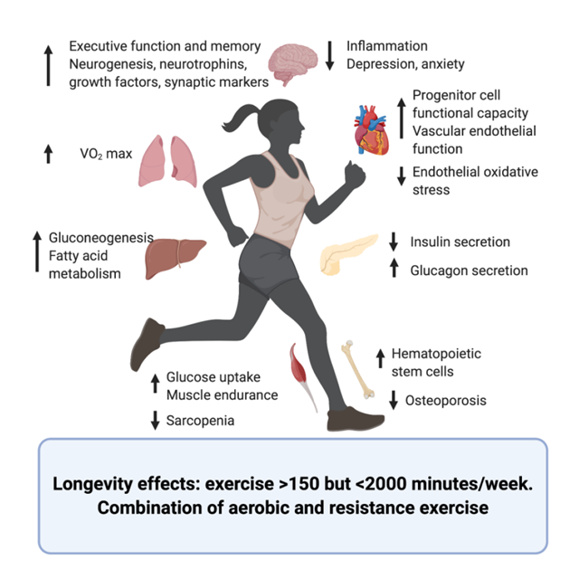 미시적인 관점에서, 운동은 미토콘드리아 생성, 세포 노화, 줄기세포 고갈, 세포 간 통신 변화를 비롯한 노화의 주요 특징
