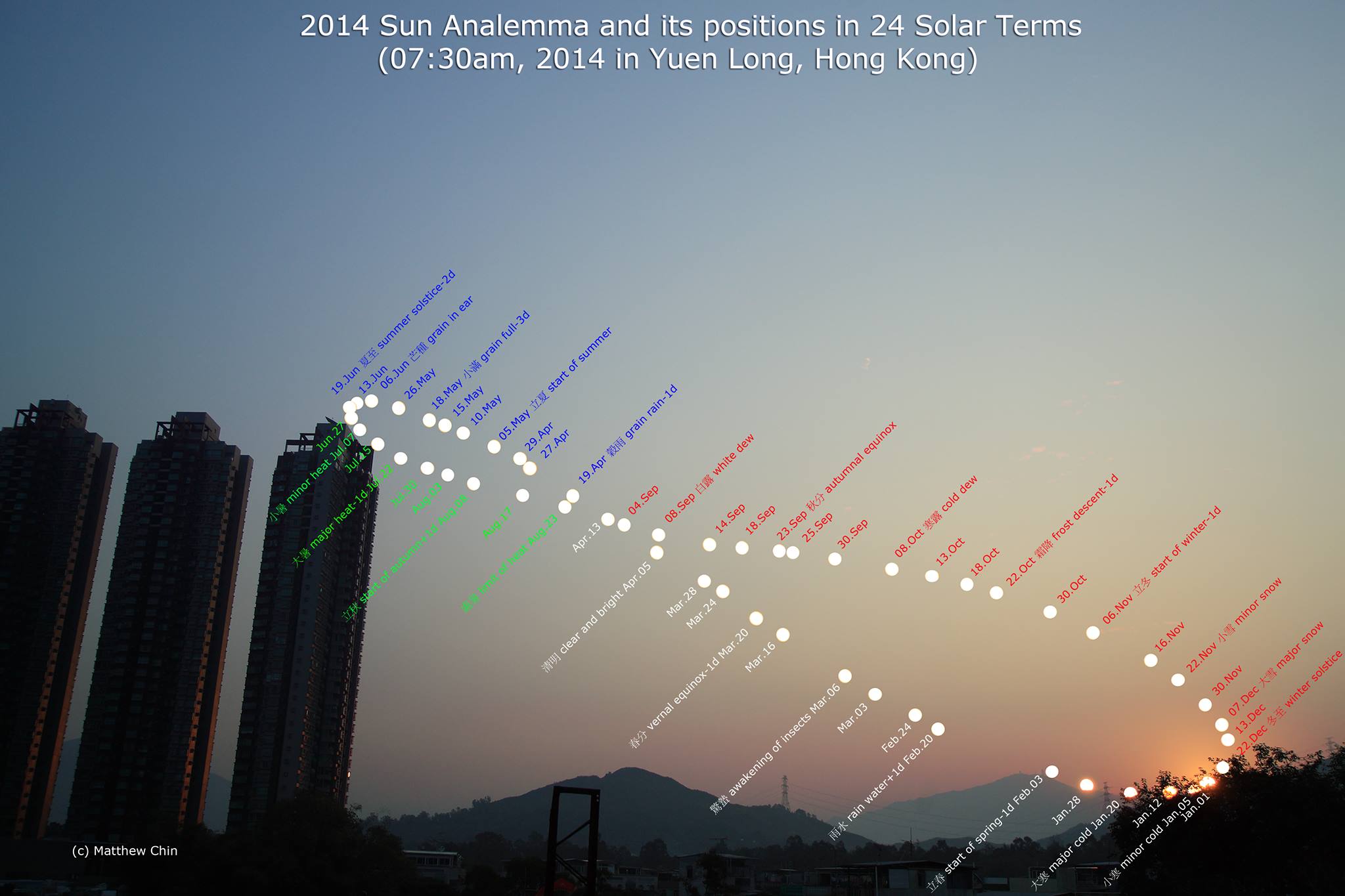 태양은 일년 내내 위치를 바꿉니다. 같은 위치에서 매일 같은 시간에 태양 사진을 찍으면 1년 동안 "아날렘마 analemma"라는 모양이 만들어집니다. 다시 똑같은 지점에 도달하면 1년이 지난 것입니다.