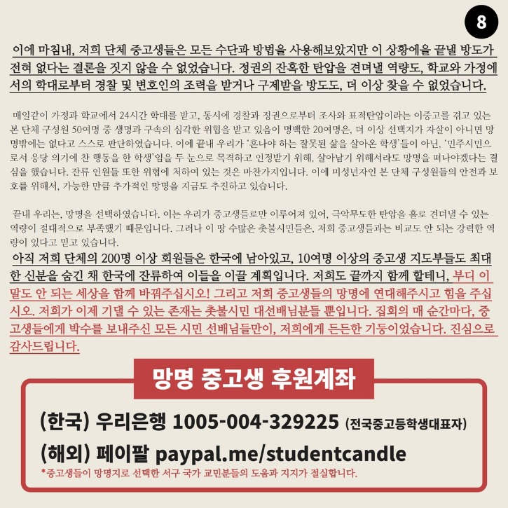 끝내 우리는, 망명을 선택하였습니다. 이는 우리가 중고생들로만 이루어져 있어, 극악무도한 탄압을 홀로 견뎌낼 수 있는 역량이 절대적으로 부족했기 때문입니다. 그러나 이 땅 수많은 촛불시민들은, 저희 중고생들과는 비교도 안 되는 강력한 역량이 있다고 믿고 있습니다.