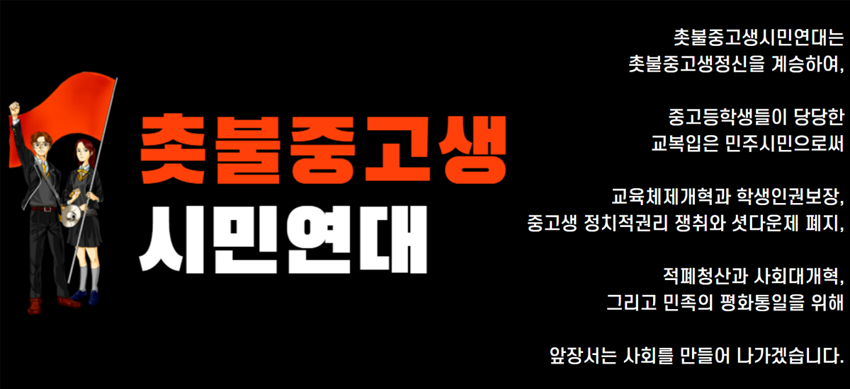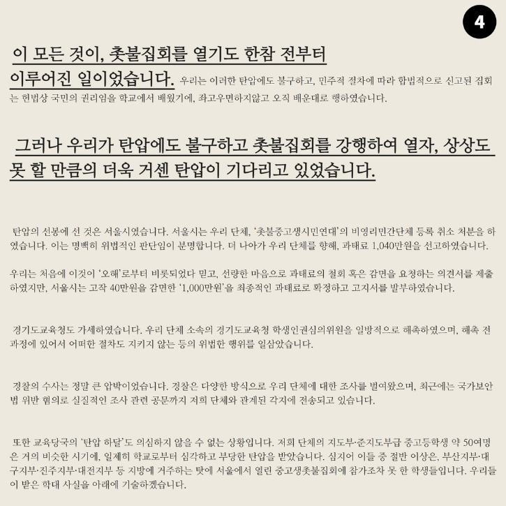 저희 중고등학생들의 대선배나 다름없는, 존경하는 촛불시민 여러분. 저희 단체는 구성원 전원이 중고등학생이거나, 졸업한 ‘선배 촛불중고생(20대)’으로 구성되어 있음에도 불구하고, 윤석열 정권으로부터 상상할 수 없을 수준의 강력한 탄압을 받아왔습니다. 이는 결코, 중고등학생이나 20대들이 견딜 수 있는 수준의 강도가 아니었습니다.
