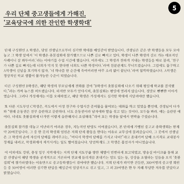 이 이외에도 강원, 충청 일부 지역에서는 저희 단체 지도부를 향한 체벌이 빈번하게 보고되었고, 방송실 마이크를 통해 교감 선생님이 해당 학생을 공개적으로 거론하며 전교에 들리게끔 혼내키는 일도 있는 등, 상상을 초월하는 일들을 오직 ‘촛불집회’에 참가하였다는 이유만으로 중고등학생들이 겪어야만 했습니다. 저희 단체가 파악한 건들만, 300여명의 중고생 회원들 중 50여명이 이러한 심각한 탄압을 매일같이 일상적으로 겪고 있고, 그 외 20여명은 한 두 차례 부당한 처우를 받았다고 밝혔습니다.