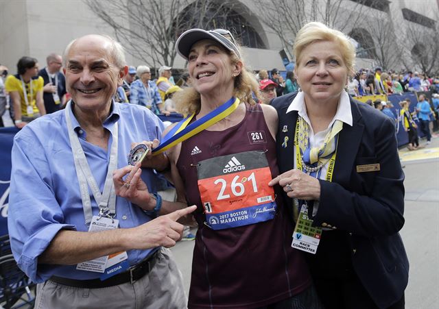 1967년 보스턴마라톤을 여성 최초로 ‘공식’ 완주한 캐서린 스위처(70ㆍ미국)가 18일(한국시간) 출전 50주년을 기념해 제121회 보스턴마라톤을 다시 완주했다.