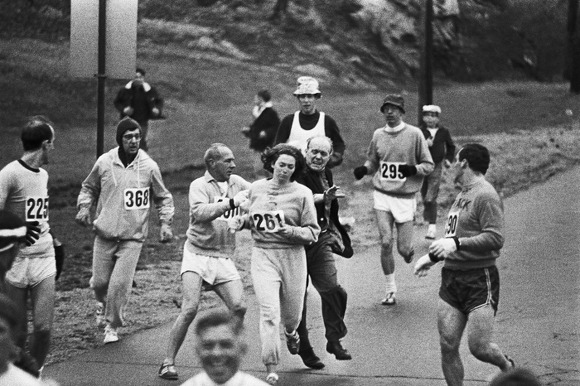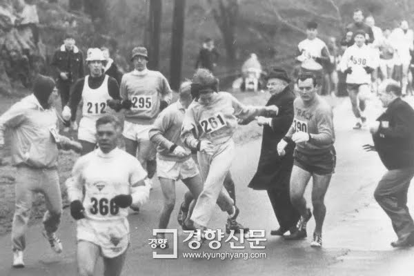 캐서린 스위처는 최초의 공식 여성 마라토너다. 불과 33년 전까지 여성은 ▲다리가 굵어지고 ▲가슴에 털이 날 수 있으며 ▲자궁이 떨어질 수도 있다는 이유로 마라톤 출전이 허락되지 않았다. 스위처는 1966년 출발선 근처 덤불에 숨어 있다가 다른 주자들 틈에 섞여 마라톤에 참가한 여성 로베르타 깁(75ㆍ미국)의 이야기를 전해 듣고, 이듬해 보스턴마라톤 출전을 결심한다. 귀걸이를 하고 립스틱을 짙게 바른 채 출발선에 선 스위처에게 주위에서 립스틱을 지우는 게 어떠냐고 조언했지만 스위처는 “절대 지우지 않을 것”이라고 반박했다.