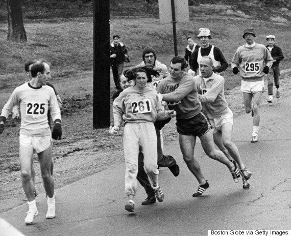 스위처가 6km 구간을 통과할 즈음, ‘여자’가 뛰고 있다는 사실이 대회 조직위원회에 알려졌다. 대회 감독관 겸 조직위원장 조크 샘플이 살기를 띤 얼굴로 스위처에게 달려들어 어깨를 낚아챘다. 그는 “번호표를 내놓고 내 레이스에서 꺼져”라고 소리쳤다. 그녀와 동행한 코치 어니 브릭스와 애인 톰 밀러가 감독관을 저지해 마침내 스위처는 4시간 20분의 기록으로 피투성이가 된 발과 함께 완주에 성공한다.