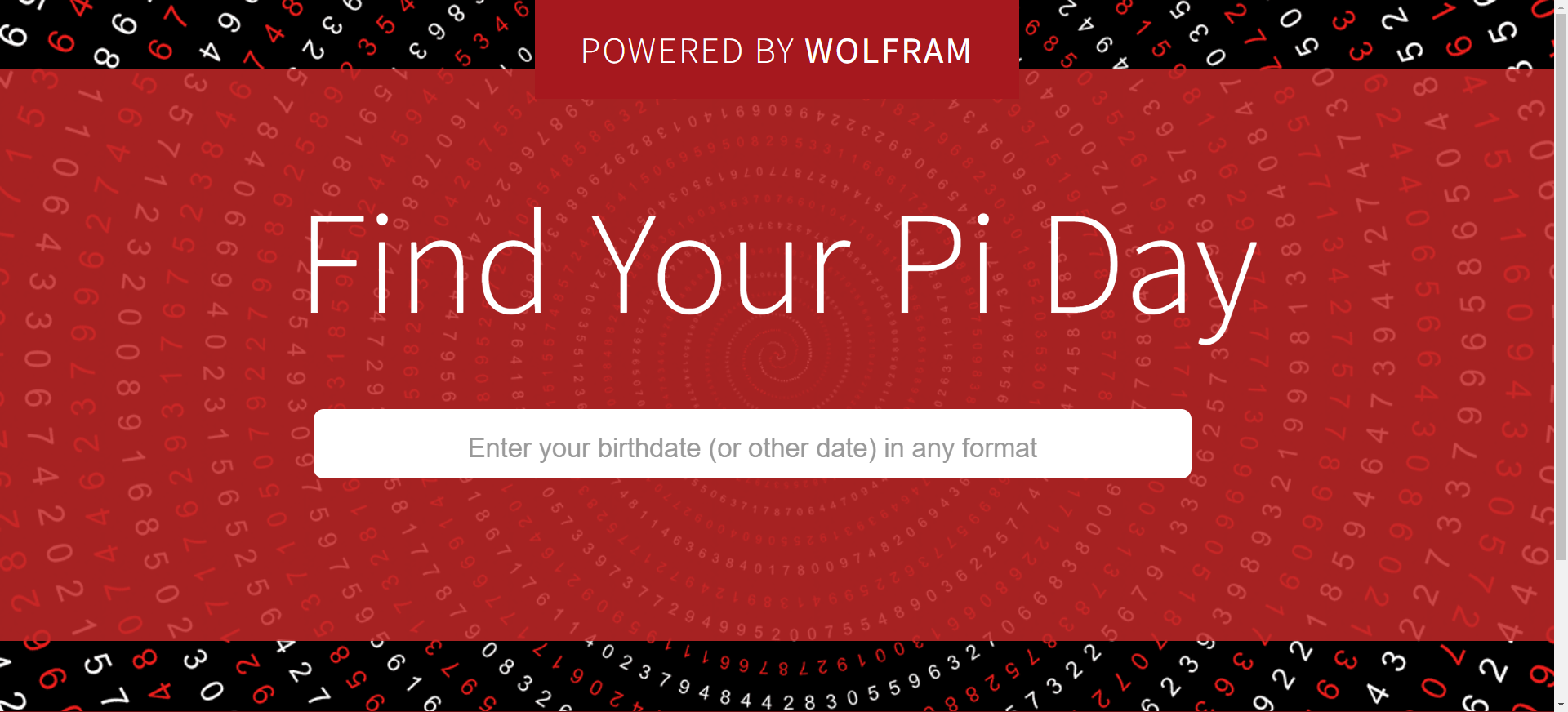 파이는 무작위로 분포된 무한한 소수를 가지고 있습니다.(파이(π) 값 소수점 아래 62조 8000억 번째 자리까지 알아냈다) 원주율의 모든 소수점을 보면 숫자 문자열 내에서 생일(월, 일, 연도)을 찾을 수 있습니다. 사실, 이 도구를 사용하여 파이 내에서 생일이 어디에 속하는지 알아낼 수 있습니다.