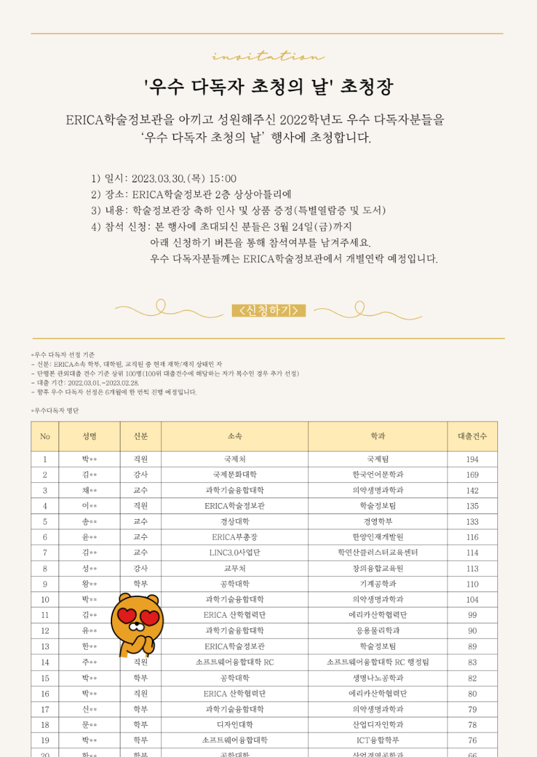 안녕하세요. 2022학년 우수 다독자에 선정되신 것을 진심으로 축하드립니다. 감사의 마음을 담아 『우수 다독자 초청의 날』 행사를 준비하였습니다. 아래 내용을 참고하셔서 행사 참석 신청을 해주시기 바랍니다. 감사합니다.
