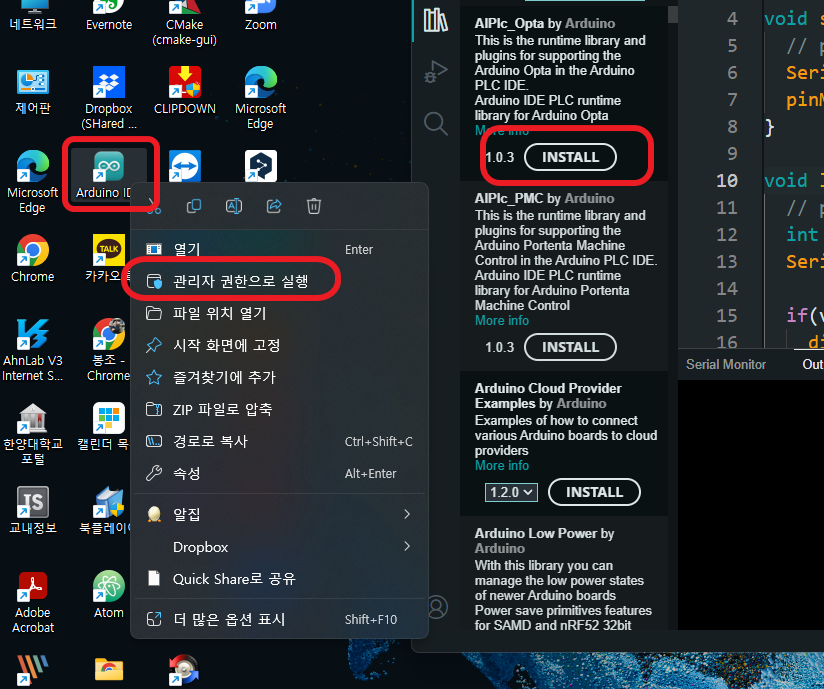 간혹 아두이노 개발환경을 실행할 때 관리자 권한으로 실행하지 않는 경우가 있다. 그래서 라이브러리 매니저에서 라이브러리를 찾아 설치할 때 메시지로 이런 게 뜬다. Error 13: Library install failed at mkdir - Arduino IDE 2.0
