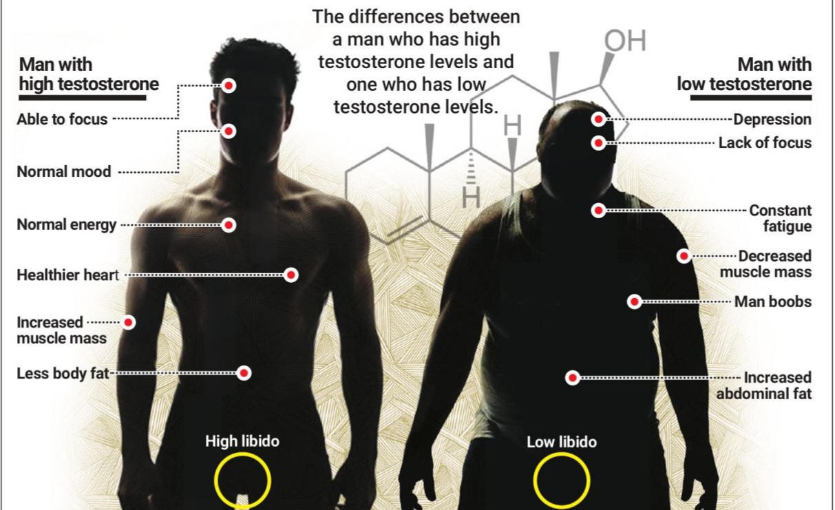 남성에게서 테스토스테론은 고환이나 전립선 등 남성의 생식 기관의 발달, 근골격 크기 증대나 체모 성장 등 2차 성징 촉진에 중요한 역할을 한다. 또한 남성과 여성 모두에게 있어 테스토스테론은 기분이나 행동 등에 관한 건강과 행복, 그리고 골다공증 예방에 관여한다. 남성이 테스토스테론이 부족하면 허약과 골손실을 야기한다.