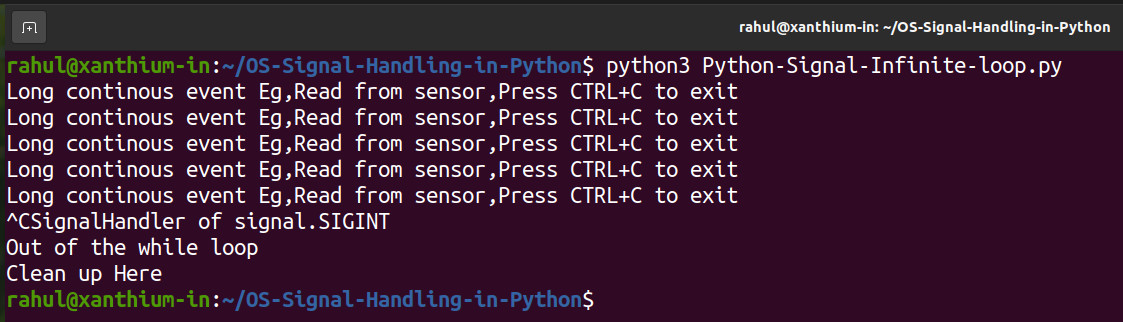 이제 스크립트가 수행하던 작업을 중지하고 직렬 포트 개체 또는 파일 개체와 같은 열려 있는 모든 리소스를 닫는 동안 정상적으로 종료하려고 합니다. 여기에서 OS 신호를 사용하여 무한 루프 실행을 중단할 수 있습니다.