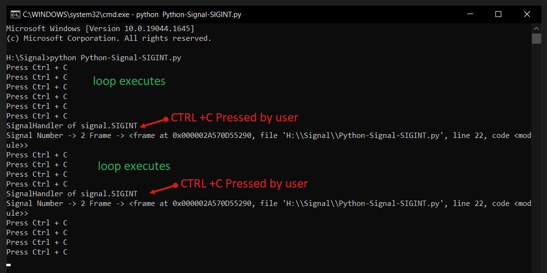 - 키보드에서 CTRL + C를 누르면 OS(Windows/Linux)에서 SIGINT 신호가 생성되어 실행 중인 스크립트로 전송됩니다.