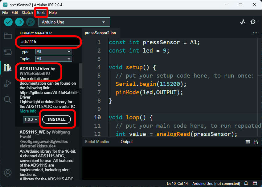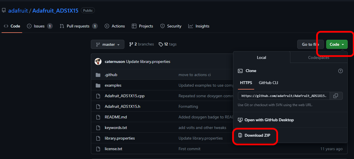 코드를 입력하기 전에 아두이노 환경에 adc 라이브러리를 설치해야 합니다. adafruit / Adafruit_ADS1X15 라이브러리 주소를 참고하세요. 설치방법 간단하게 알려드리면 위 링크는 Github 링크인데 좌측 code 를 눌러 zip 파일을 다운 받습니다. 그리고 아래 두 번째 이미지의 스케치 - include library 로 가서 add zip library를 선택 후 다운 받은 zip 파일을 선택해주면 됩니다.