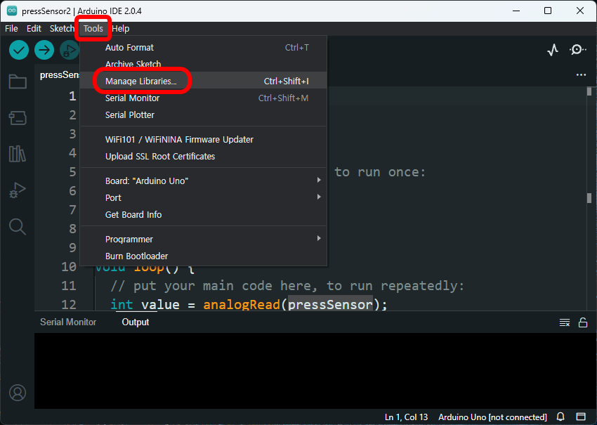 더 간단한 두번째 방법은 아래 이미지에서 처럼 툴 - manage library로 가서 검색해서 설치합니다. 적당한 라이브러리를 설치하는 것을 잊지 마세요. 설치 후 File - Example 메뉴에서 아마도 예제를 발견하실 수 있습니다. 부디~^^