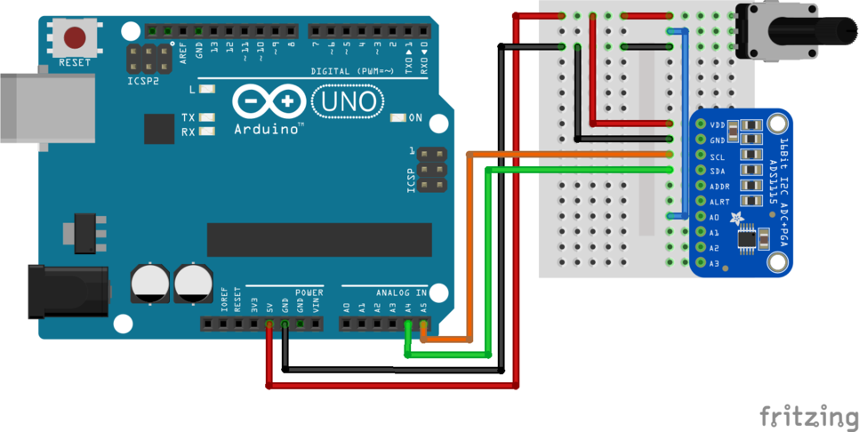 모듈의 동작을 확인하기 위해서 아날로그 전압을 출력할 수 있는 10k가변저항을 이용한 회로를 사용했습니다. 아래 가변 저항을 연결한 그림을 참고하세요.
