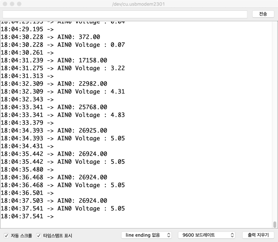 //신호핀에 아무것도 연결되어 있지 않으면 의미 없는 값이 출력됩니다.