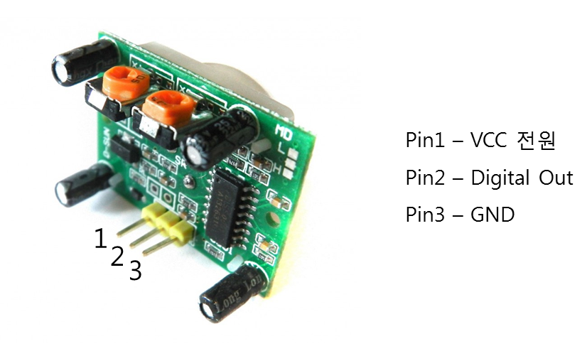 Sensitivity Adjust 가변저항을 왼쪽 끝까지 돌리면 민감도가 가장 약하고, 오른쪽으로 돌리면 민감도가 증가한다. 실습시에는 왼쪽 끝으로 돌려서 민감도를 제일 약하게 하는 것이 편할 것이다. Time Delay Adjust 가변저항은 오른 쪽으로 돌리면 하이가 계속 출력되는 시간이 길어지고, 왼쪽으로 돌리면 약 4초 후에 로우로 떨어지게 된다. 실습에서는 가장 왼쪽으로 돌려 일찍 로우상태(대기상태)로 되도록 하는 것이 결과를 확인하기 쉽다.