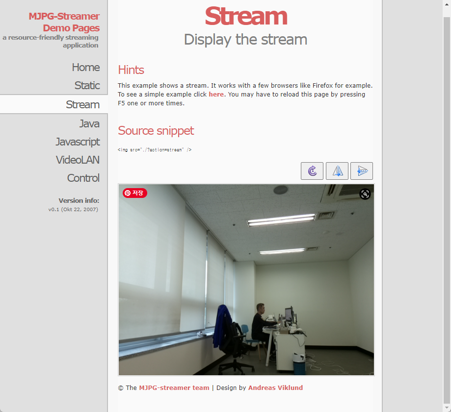 영상을 확인하기 위해 브라우저에서 http://라즈베리파이 IP주소:8080 을 입력하면 아래와 같은 화면에서 stream을 선택해 실시간 동영상 파일을 볼 수 있다.