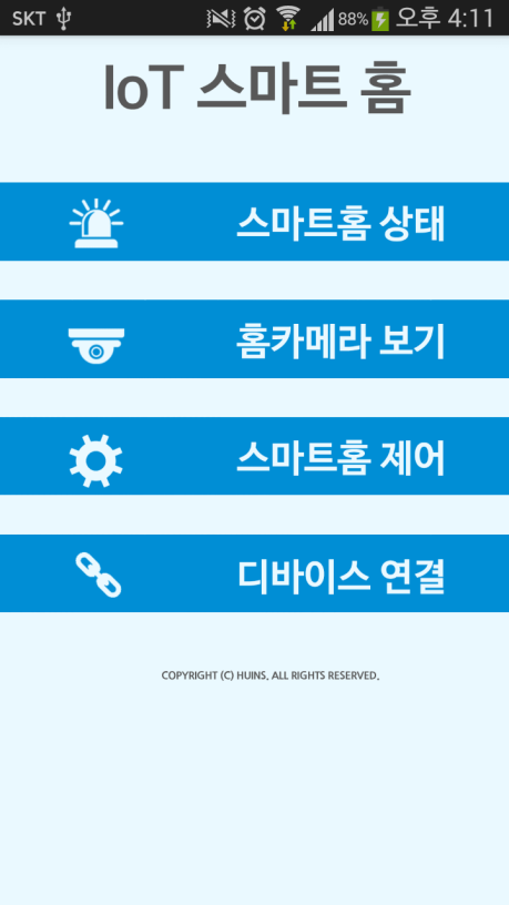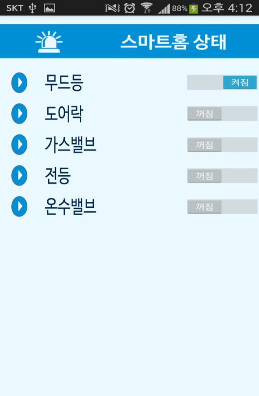 이 상태에서 모든 준비가 끝났다. 안드로이드 폰으로 다운 받은 스마트 홈 앱을 실행시키면서 결과를 확인한다. 아래는 앱 실행 메인 화면이다.