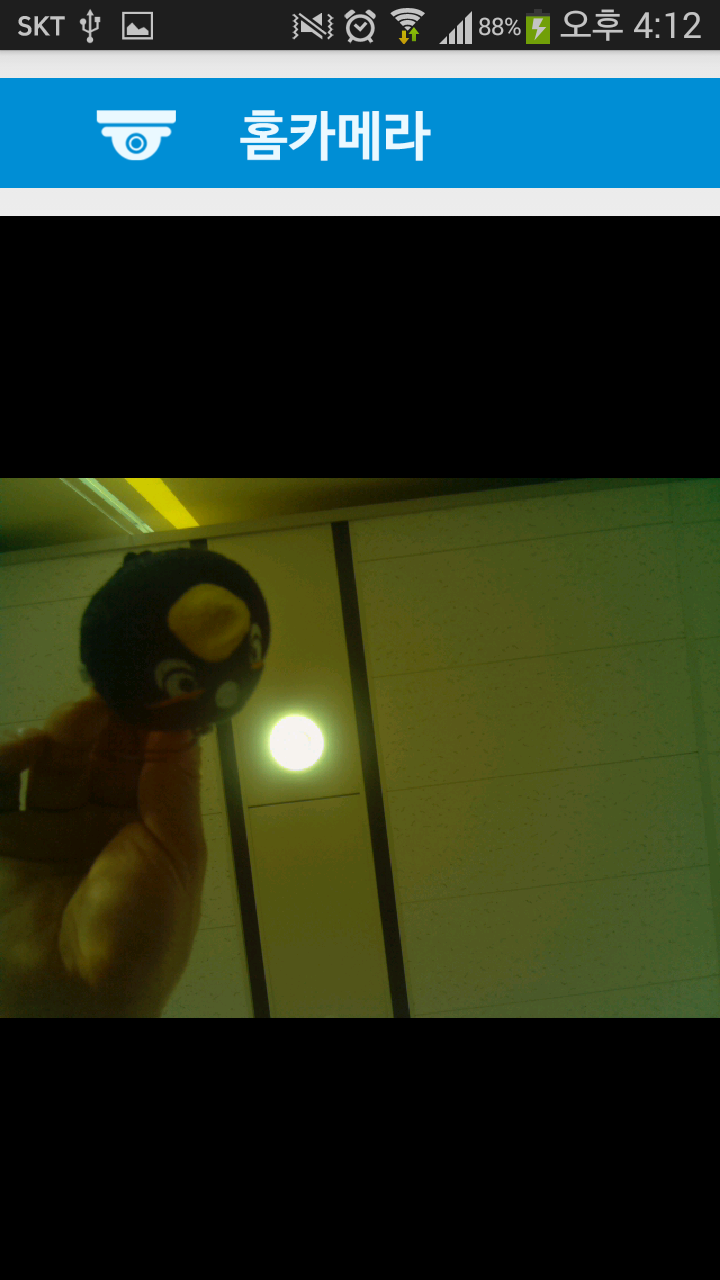 스마트 홈 카메라 보기에서는 실시간으로 동영상 스트리밍이 되는 것을 보여준다. 라즈베리 파이에 연결된 카메라는 영상을 촬영하여 mjpg 스트리밍을 사용하여 스마트 폰으로 전송한다. 카메라 영상은 약간의 시간 지연을 가지고 있지만 해상도는 높은편으로 선명한 화질이 제공된다.