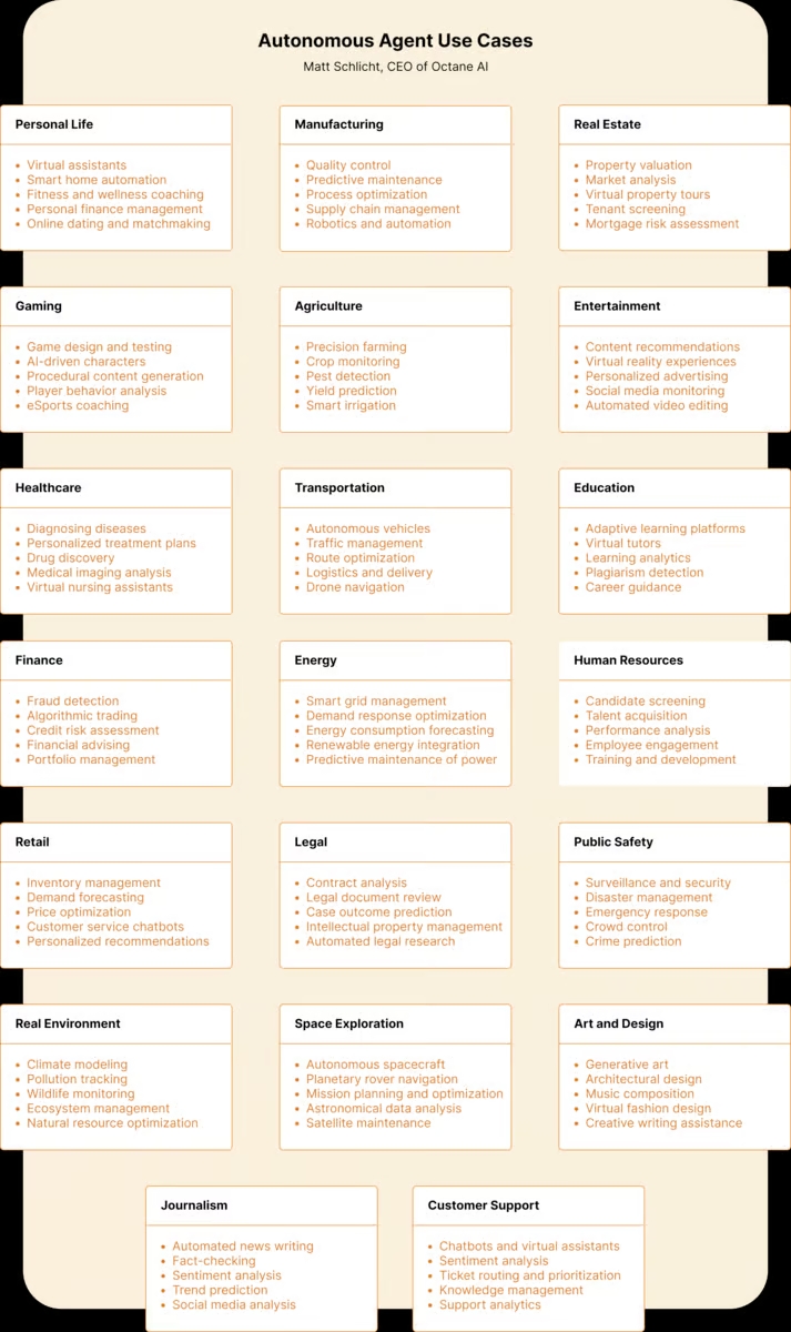 이러한 자율 에이전트는 모든 산업과 상상할 수 있는 모든 업무에 존재할 것입니다. 이는 몇 가지 예에 불과합니다. 상상의 나래를 마음껏 펼치세요.