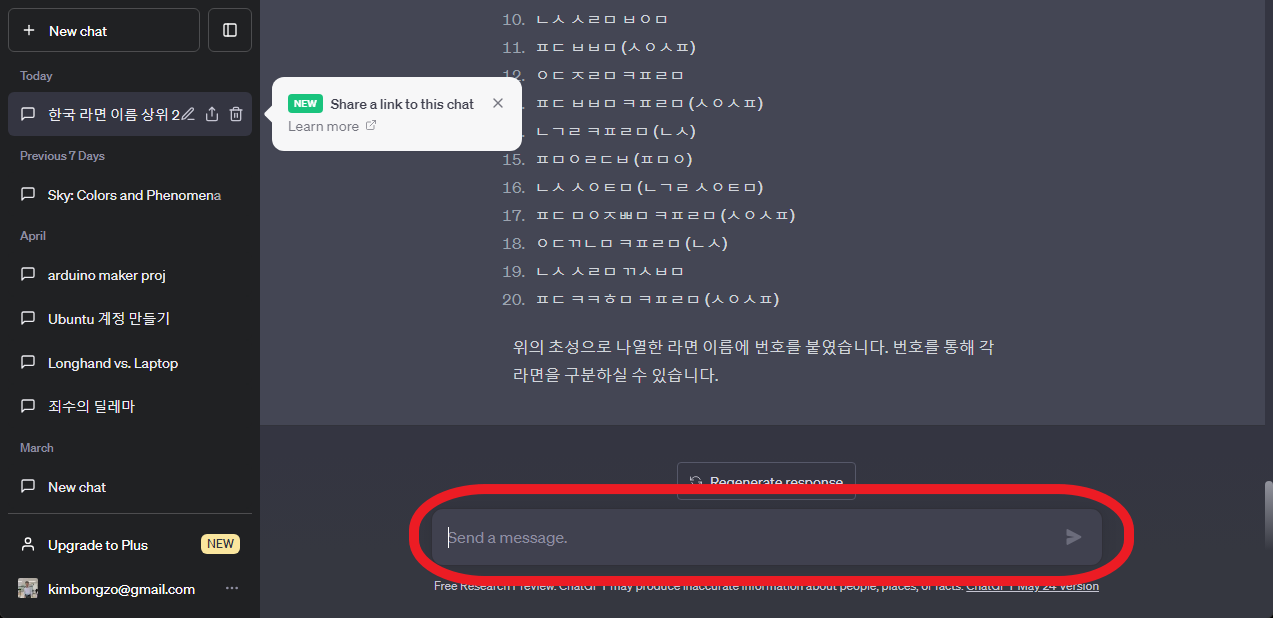 일단 사이트에 접속하면 아래와 같은 화면이 되고 맨 아래 프롬프트 입력란에 아래 순서로 입력한다. 결과를 보여주는 텍스트도 아래에 나타낸다.