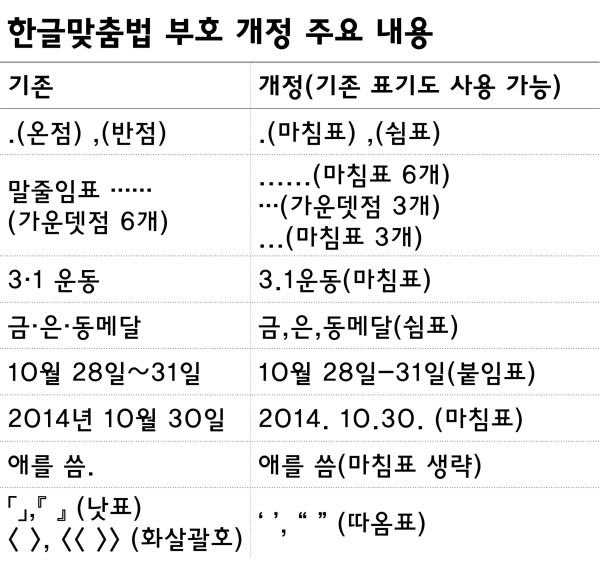문장 부호 해설 컴퓨터 중심으로 변화한 글쓰기 환경에 맞추어 문장 부호에 대한 내용이 개정되었다. 『문장 부호 해설』에서는 2014년에 고시된 「한글 맞춤법 일부 개정안」의 「문장 부호」 규정에 미처 담지 못한 구체적인 상황에서의 문장 부호 용법들을 확인할 수 있다.