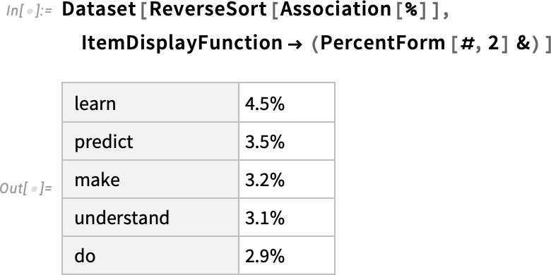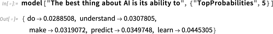 나중에 이 신경망의 내부를 살펴보고 작동 방식에 대해 이야기하겠습니다. 그러나 지금은 이 "순 모델"을 지금까지 텍스트에 블랙박스로 적용하고 모델이 따라야 한다고 확률로 상위 5개 단어를 요청할 수 있습니다.