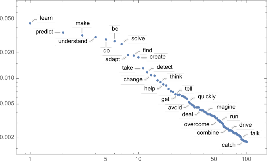 첫 번째 단계에서도 (온도 0.8에서) 선택할 수 있는 가능한 "다음 단어"가 많다는 점을 지적할 가치가 있습니다. 하지만 그 확률은 매우 빠르게 떨어집니다(예, 이 로그-로그 플롯의 직선 언어의 일반 통계의 매우 특징적인 n –1 "멱법칙" 붕괴에 해당 ):