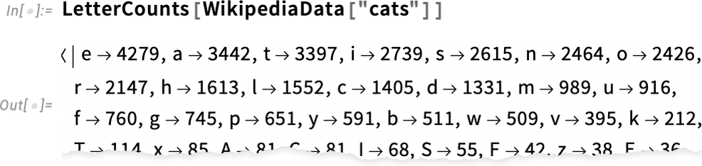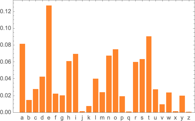 우리가 할 수 있는 아주 최소한의 일은 영어 텍스트의 샘플을 취하고 그 안에 얼마나 자주 다른 문자가 나타나는지 계산하는 것입니다. 예를 들어 "고양이"에 대한 Wikipedia 기사의 문자 수를 계산합니다.