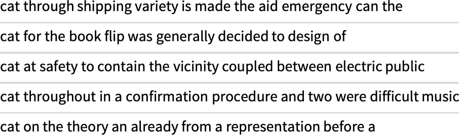 당연히 이것은 난센스입니다. 어떻게 하면 더 잘할 수 있을까요? 문자와 마찬가지로 단일 단어에 대한 확률뿐만 아니라 쌍 또는 더 긴 n -그램 단어에 대한 확률도 고려할 수 있습니다. 쌍으로 이 작업을 수행하면 모든 경우에 "고양이"라는 단어로 시작하는 5가지 예가 있습니다.