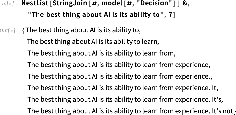 반복적으로 "모델을 적용"하면 어떻게 됩니까? 각 단계에서 확률이 가장 높은 단어를 추가합니다(이 코드에서는 모델의 "결정"으로 지정됨).