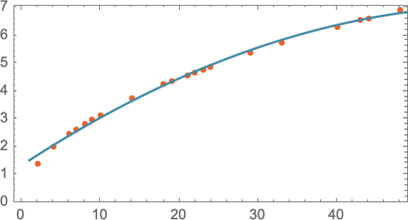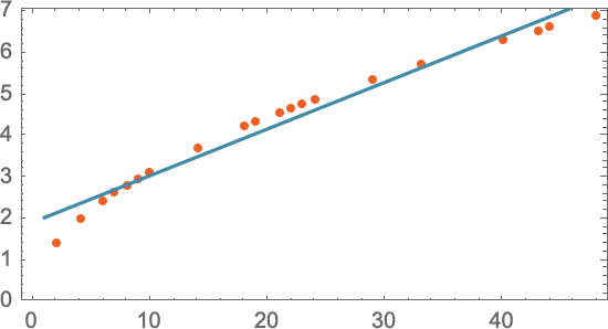 여기서 직선을 사용하는 방법을 어떻게 알았습니까? 어떤 수준에서는 그렇지 않았습니다. 그것은 수학적으로 단순한 것일 뿐이며, 우리는 측정한 많은 데이터가 수학적으로 간단한 것에 잘 맞는 것으로 판명된다는 사실에 익숙합니다. a + b x + c x 2와 같이 수학적으로 더 복잡한 것을 시도할 수 있으며 이 경우에는 더 잘할 수 있습니다.