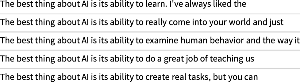 그러나 항상 "최상위" 단어를 선택하는 대신 때때로 임의로 "비상위" 단어를 선택하는 경우("온도" 0.8에 해당하는 "무작위")는 어떻게 됩니까? 다시 텍스트를 작성할 수 있습니다.