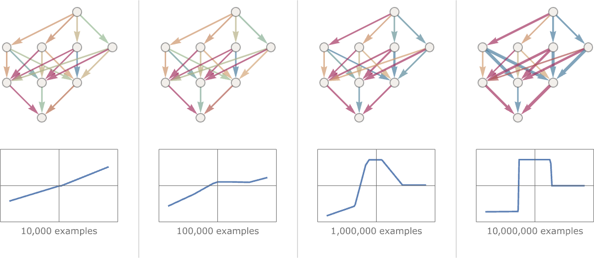 그리고 우리가 보는 것은 그물이 너무 작으면 우리가 원하는 기능을 재현할 수 없다는 것입니다. 그러나 일정 크기 이상에서는 문제가 없습니다. 최소한 충분한 예제와 함께 충분히 오랫동안 훈련한다면 문제가 없습니다. 그런데 이 그림은 신경망 지식의 일부를 보여줍니다. 즉, 모든 것이 더 작은 중간 수의 뉴런을 통과하도록 하는 중간에 "압착"이 있으면 더 작은 네트워크로 종종 벗어날 수 있다는 것입니다. (또한 "중간 계층 없음" 또는 소위 " 퍼셉트론 "이라고 하는 네트워크는 본질적으로 선형 함수만 학습할 수 있지만 중간 계층이 하나만 있어도 원칙적으로 항상 가능하다는 점을 언급할 가치가 있습니다. 최소한 하나의 뉴런이 충분하다면 어떤 함수라도 임의로 근사화할 수 있지만, 실행 가능하게 훈련할 수 있도록 일반적으로 일종의 정규화 또는 정규화를 가집니다.)