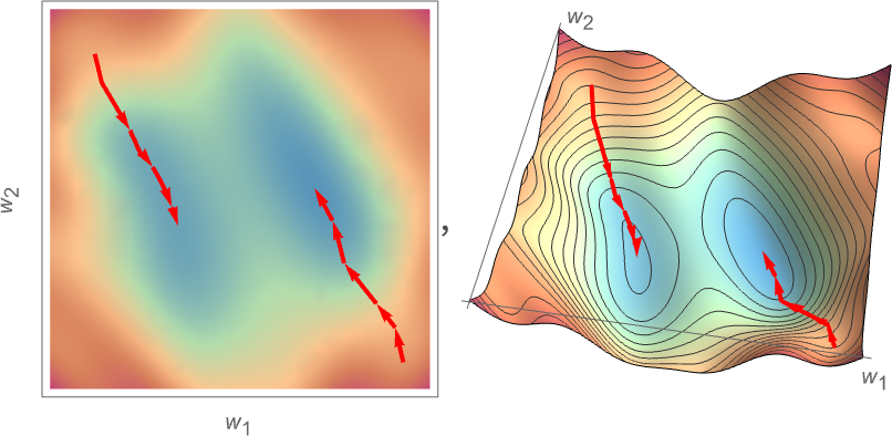 수치해석은 이와 같은 경우에 최소값을 찾기 위한 다양한 기술을 제공합니다. 그러나 일반적인 접근 방식은 이전 w 1 , w 2 에서 가장 가파른 내리막 경로를 점진적으로 따르는 것입니다.
