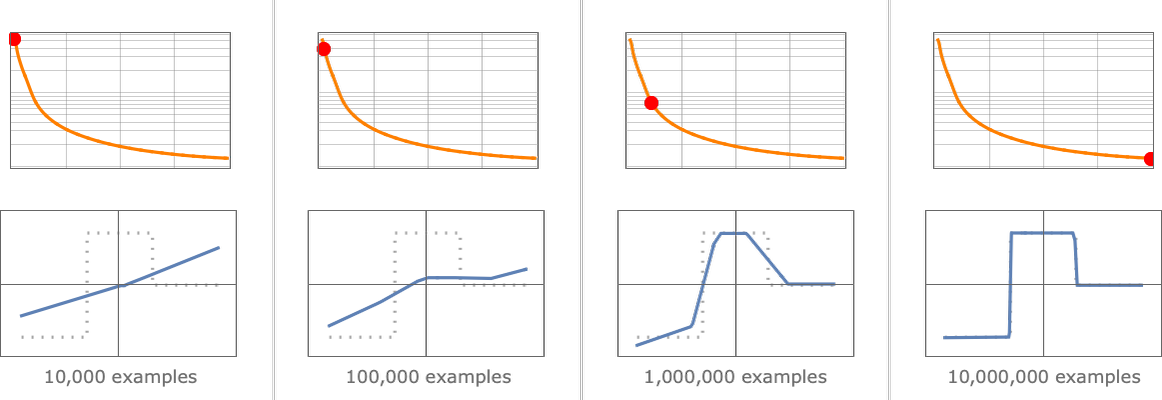 기본 아이디어는 "학습"을 위해 많은 "입력 → 출력" 예제를 제공한 다음 이러한 예제를 재현할 가중치를 찾는 것입니다. 점진적으로 더 많은 예제를 사용하여 수행한 결과는 다음과 같습니다.
