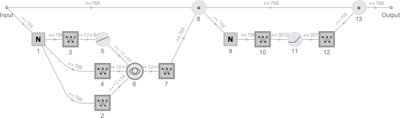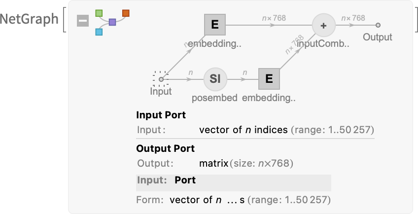먼저 임베딩 모듈이 있습니다. 다음은 GPT-2에 대한 개략적인 Wolfram 언어 표현입니다.