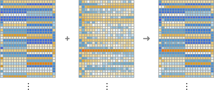 각 토큰에 대한 임베딩 벡터의 요소는 페이지 아래에 표시되며 페이지 전체에서 먼저 " hello " 임베딩 실행과 " bye " 임베딩 실행을 볼 수 있습니다. 위의 두 번째 배열은 위치 임베딩으로, 다소 임의적으로 보이는 구조가 "우연히 학습된" 것입니다(이 경우 GPT-2).