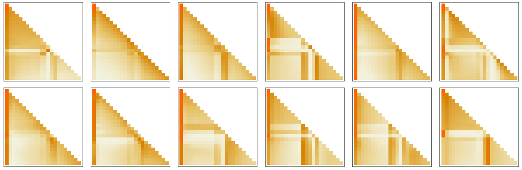 더 자세한 수준에서 어텐션 헤드가 하는 일은 서로 다른 토큰과 관련된 임베딩 벡터의 청크를 특정 가중치로 재결합하는 것입니다. 예를 들어, 첫 번째 어텐션 블록(GPT-2)에 있는 12개의 어텐션 헤드는 다음과 같습니다(“look-back-all-the-way-to-the-beginning-of-the-sequence-of- 토큰") 위의 " hello , bye " 문자열에 대한 "재조합 가중치" 패턴: