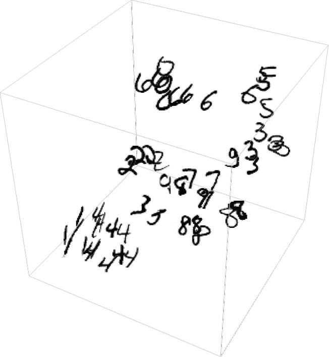 손으로 쓴 숫자에 대한 "이미지 공간"의 명시적 시각화를 만들고 싶다면 우리가 얻은 500차원 벡터를 효과적으로 투영하여 "차원을 축소"해야 합니다. 예를 들어 3D 공간: